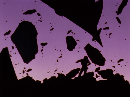 When Saionji and Utena arrive at the arena, they are greeted by a haunting sight: a giant rose with a coffin in the center, which creaks open to reveal an unconscious Anthy surrounded by white roses.  As they run to her, the rose shoots up on a column of bricks.  Several other columns rise as well, including under Utena’s feet, but Saionji remains alone on the floor.  The castle begins to crumble, and Saionji just…laughs.  “I’m here, End of the World! Keep your promise to me! Give me eternity!”  Instead, he is almost crushed by a falling tower.  This cements that he does not care for Anthy, that he only desires that “something eternal”.  Utena, on the other hand, leaps to Anthy’s rescue with little regard for her own safety, pulling her from the coffin.