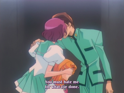 Although his duel in the Student Council Saga make Saionji’s influences and motivations more clear, they do not excuse his behavior.  He kidnaps Anthy, taking her to the arena against her will when there is no duel scheduled, which is expressly forbidden.  Utena goes to rescue her and finds Saionji in the water and unconscious.  She questions him, asking, “Do you really love Himemiya?  Then why did you try to win her in a duel?”