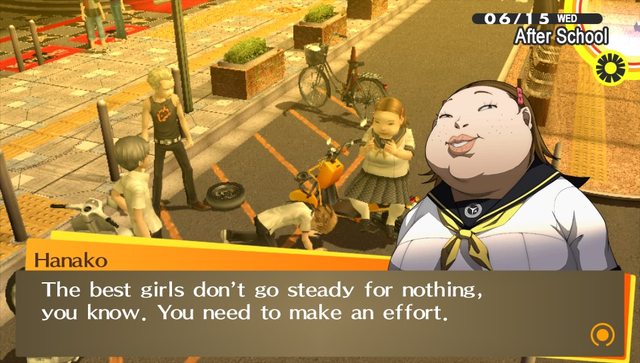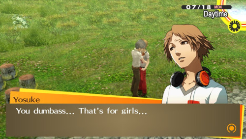 That said, Persona 4 does fall back on tired, gendered tropes for its humor a bit too often for comfort – that is to say, at all. It is sparse compared to the rest of the content, and the things that the game does right more than cancel it out, but I still couldn’t help but cringe at some parts. Jokes about none of the female characters being able to cook feel out of place juxtaposed with complex character arcs. Naoto’s discomfort with her body, particular her breast size – whether true trans-related dysphoria, garden-variety body image struggles, or somewhere in-between – is also played for laughs, which is a very real problem for many teenagers and wholly inappropriate.