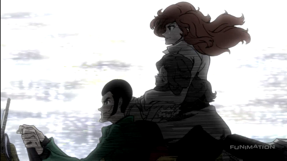 He worships her – when Jigen is confused about why he’s so devoted, Lupin tells him, “Are you blind? She’s national treasure class.” However, it wouldn’t be fair to say he idealizes her – it’s more that Fujiko is his ideal. He supports her every step of the story, and it’s because of his willingness to investigate on her behalf that they were able to solve the mystery at the center of the story. He investigates Glaucus Pharmaceuticals, subjecting himself to a hefty dose of Fraulein Eule, the painful and frightening hallucinogen, to find answers. His attention to detail allows him to see through misdirections that confound other characters. When Oscar is posing as Fujiko, Lupin is the first to realize, “This M.O. is too flashy for Fujiko,” while Zenigata just thinks of her as another worthless thief. He figures out that the memories Fujiko describes can’t be real because she mentions how they burned her feet, but the soles of her feet are pristine. Lupin, instead of operating on preconceived notions and expectations of women, values Fujiko for herself. He defies Aisha and her mother when they demand he kill her, even when they threaten his life. Even as she nearly succumbs to Almeida’s conditioning, he tells her, “The marionette strings have been cut. A woman who’s just some passive doll is no fun. Come on, show me your power.” And she does, because he has been there to support her. He sees her as a person, unlike any other character, and so he gets to be by her side to the end.