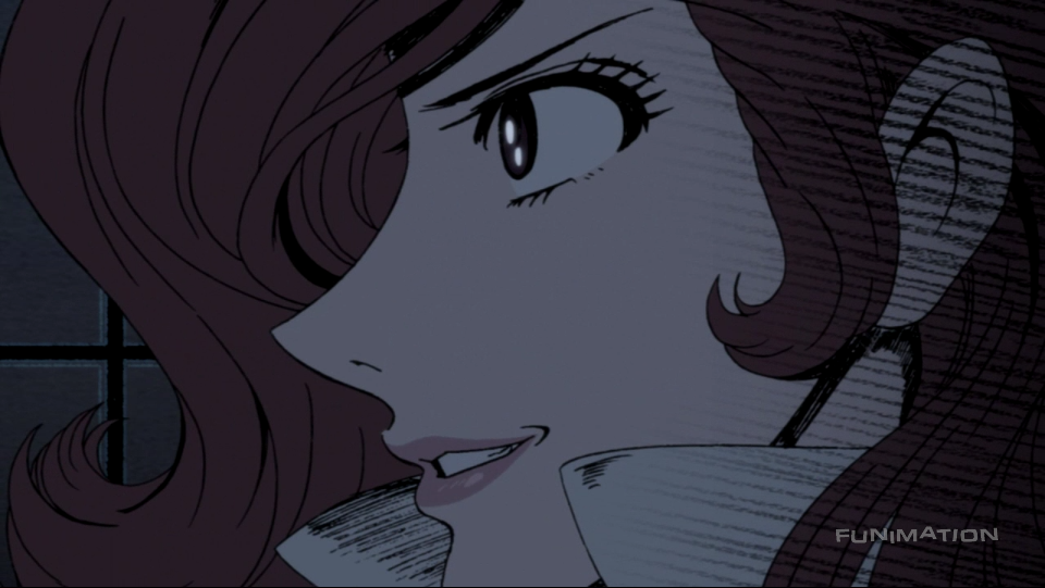 Both men have inauthentic relationships with her due to their preconceived notions about women. Although Fujiko gives him plenty of reason to dislike her later, Jigen is dismissive of her from the start, telling his boss, “Babysitting women ain’t part of the bodyguard’s job description”. When she tries to seduce him, he bluntly says, “I just hate women, I’m afraid,” and holds her own knife up to her throat. His read of Fujiko’s duplicitousness here may be correct, but it doesn’t change that he makes quite a few assumptions and for the rest of the series, he is baffled as to why Lupin holds her in such high regard. Goemon’s assumptions about women take the form of a classic virgin/whore complex. Even after she reveals herself as a thief, he thinks of her as the virtuous governess Maria. Fujiko takes advantage of his naivete, kissing him naked on the rooftop and calling him “Boyfriend-san” (though this is doubtless partly because continuity demands the two be dating by the start of Green Jacket). Fujiko’s behavior during her breakdown surprises him – when he offers her food, she throws it at him and shouts, “What’s your deal? Do you think you’re my guardian?! What are you after?! If you want to sleep with me, quit beating around the bush!” Downstairs, he cleans his sword and thinks, “She’s a shameless minx without a doubt. Once, I thought of Fujiko Mine as a holy woman.” He doesn’t need to say the rest – if this unbalanced, lingerie-clad woman screaming at him about sex is not holy, then she is fallen. He is incapable of seeing her for what she is: a complex human going through a trying time.