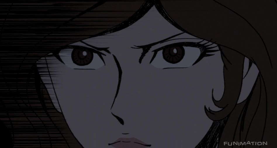 In a flashback, we see that Fujiko saw a commercial for the girl while watching TV with one of her latest gold digging victims. When the commercial announces, “Enjoy a sublime work of art along with the tale called ‘Her Life’,” Fujiko grows upset. As she goes to wash her face, “The tale called ‘life…’ The tale called ‘Fujiko Mine’… give your tale… to me,” flashes across the screen, intercut with shots of a young girl being operated on by a group of owl-headed men while conscious and terrified. This isn’t the first time the audience has seen this little girl, as throughout the series we’ve seen flashes of her being tortured and raped by the owl men. Fujiko says to herself, “I swear I’ll make it mine,” and during the pursuit says, “That woman belongs to me.” She at once subjectifies and objectifies the girl, identifying with her while simultaneously claiming ownership. The artist co-opted her life and turned into a narrative for others to enjoy, but then Fujiko, projecting herself so strongly on the girl, attempts to co-opt it for herself. There is nothing playful or strategic about her pursuit of the Kaleidoscope Girl, only the cold intent to kill. She rushes at Lupin and Jigen shooting, unafraid to kill the man who up until then has been her partner and ally in many situations. The camera frequently focuses on her eyes, uncharacteristically cold and angry.