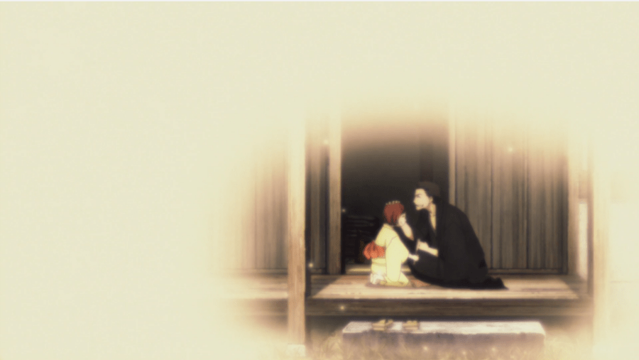 The second episode flashes back a few decades to Yakumo and Sukeroku’s youth together. Yakumo, the son of a geisha, is known as Bon, trained as a dancer until crippled by an accident. Now with no place in the floating world, Bon is sold as an apprentice to a rakugoka, the current Yakumo Yurakutei. Sukeroku, then named Shin, became an apprentice at the same time when he impressed Yakumo by imitating a rakugo performance he saw. Bon has a serious temperament and no interest in rakugo, so he feels out of place, especially next to the vivacious and outgoing Shin.